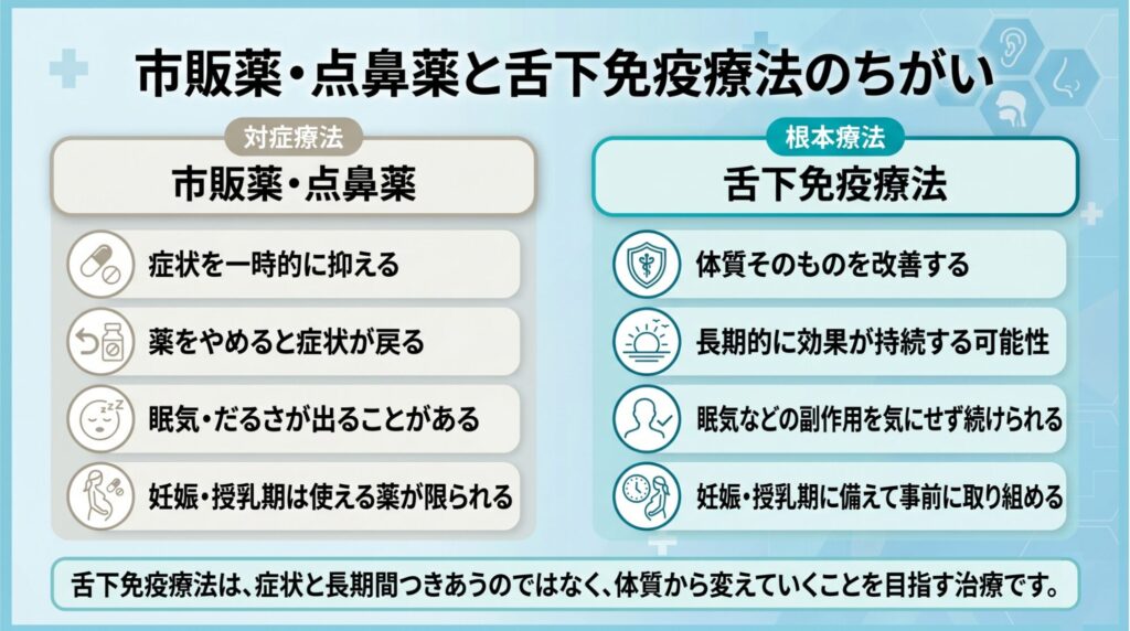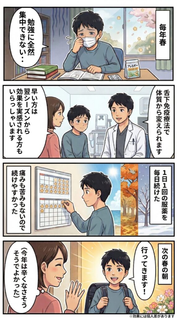 舌下免疫療法は、継続的な治療により、将来的に花粉症の症状から解放される可能性があります。