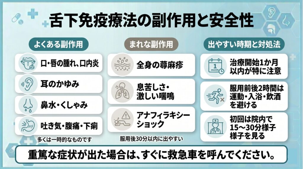 主な副作用として、口の中の腫れやかゆみ、喉の違和感、唇の腫れなどが報告されています。これらの症状は、治療開始直後や増量期に現れやすいですが、多くは一時的で、治療を続けるうちにおさまります。