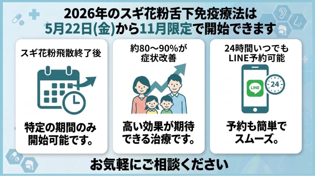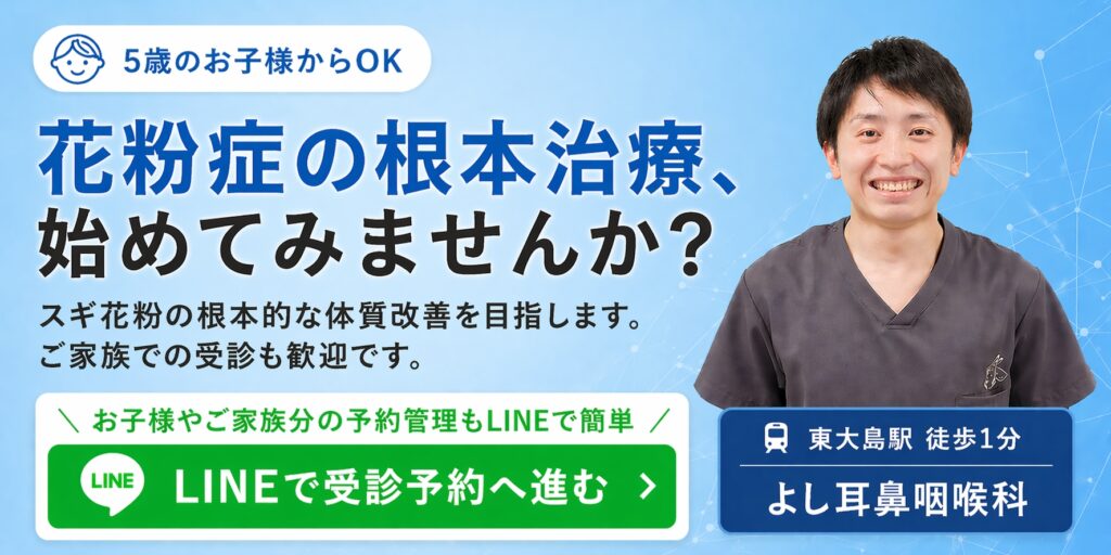 ご自身やご家族の健康、そして今後のライフステージを見据え、スギ花粉症を根本から治したいとお考えの方は、ぜひ一度、よし耳鼻科までご相談ください。