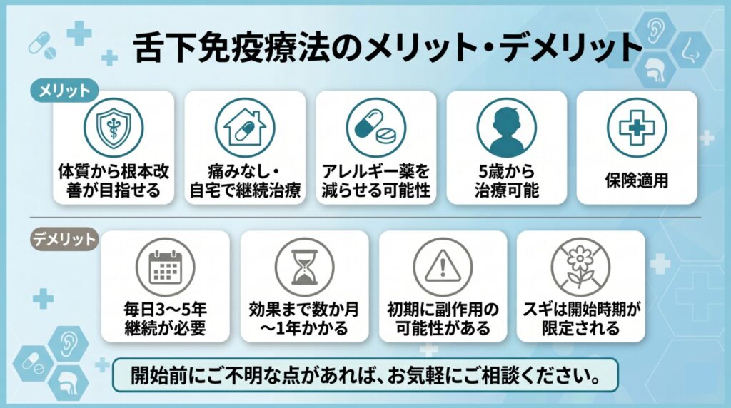 舌下免疫療法のメリットは、スギ花粉症に対する過敏な免疫反応を根本的に治すことが期待できる点と、開始後3か月〜半年前後でアレルギー症状が緩和してくる点です。
