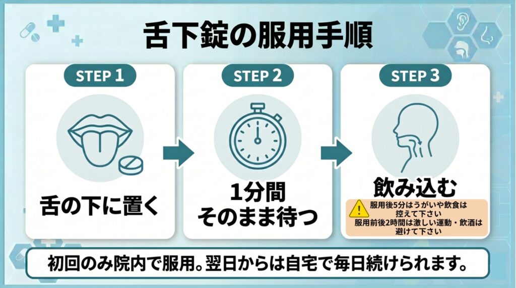 *舌下の開始については、症状が安定している方になりますので、アレルギー症状(例えば、鼻水や目の痒みなど)が強い方の場合には内服薬などで症状を落ち着かせてから導入する場合がございます。