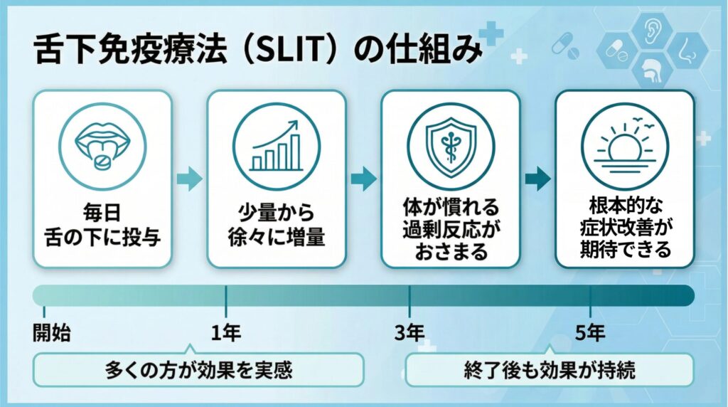 舌下免疫療法は、早い方で治療開始後3か月程度から、多くの方が1年後には効果を実感されます。治療は長期間にわたるため、耳鼻科専門医の管理・指導のもとで計画的に治療を続けることが大切です。