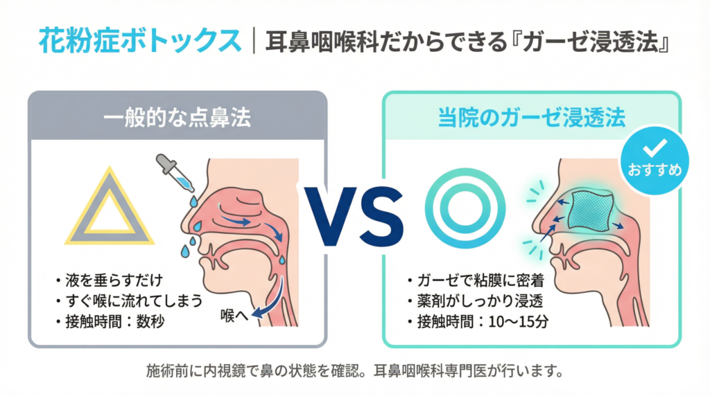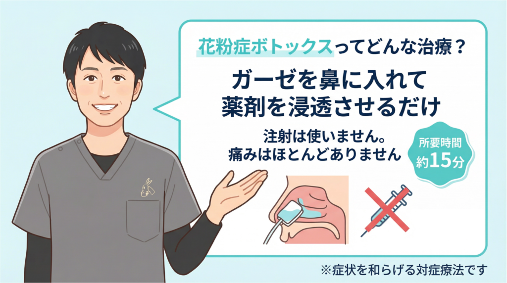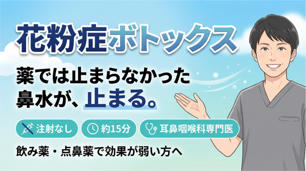 最近、美容クリニックなどで「花粉症(鼻炎)ボトックス」を見かけることが増えました。しかし、「液体を鼻に垂らしてもらったけど、すぐ喉に流れてしまった」「本当に効いているのか分からなかった」という声も少なくありません。