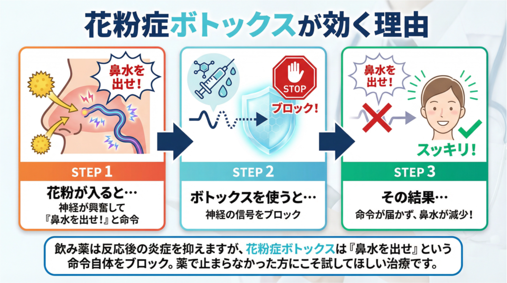 一般的な抗ヒスタミン薬は、アレルギー反応が起きた「後」の炎症を抑えるものです。一方、ボトックスは鼻水を出す「命令」自体を止めるため、薬が効きにくい方にも効果が期待できます。