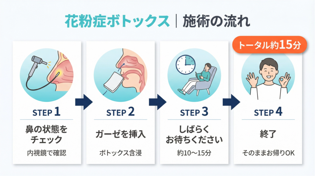 注射針を使わず、ガーゼを詰めるだけの処置です。施術直後から普段どおりの生活が可能です(直後は鼻を強くかむことだけ避けてください)。